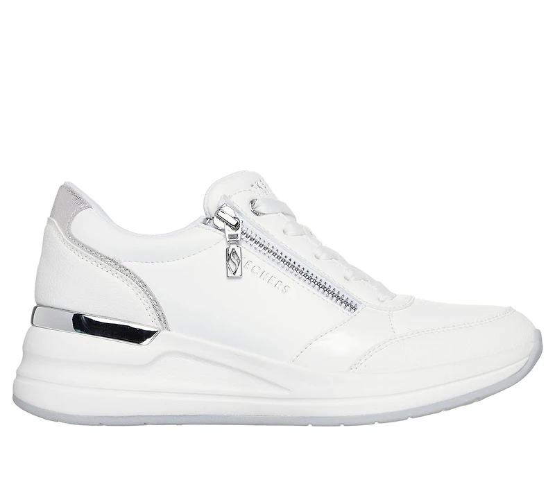Shine in sporty style wearing Skechers Street™ Billion 2 - High End. This Wedge Fit® fashion sneaker features a lace-up duraleather and genuine leather upper with patent detail, side zip closure, metallic heel clip, and our famous Skechers Air-Cooled Memory Foam® insole.