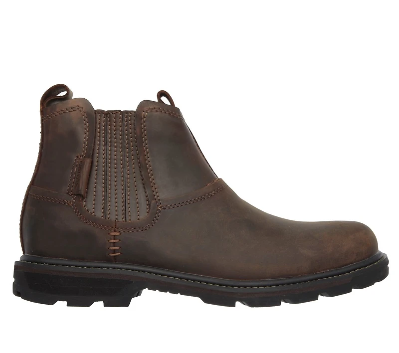 Take your style in a new direction with the SKECHERS Blaine - Orsen boot. Smooth oiled leather upper in a slip on dress casual ankle boot with stitching and overlay accents. Dual side elastic panels.