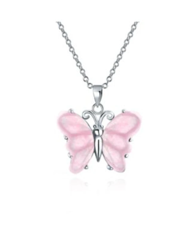 Bling Jewelry Handcrafted Carved Light Pink Natural Rose Quartz Translucent Garden Butterfly Pendant Necklace For Women Sterling Silver With Chain