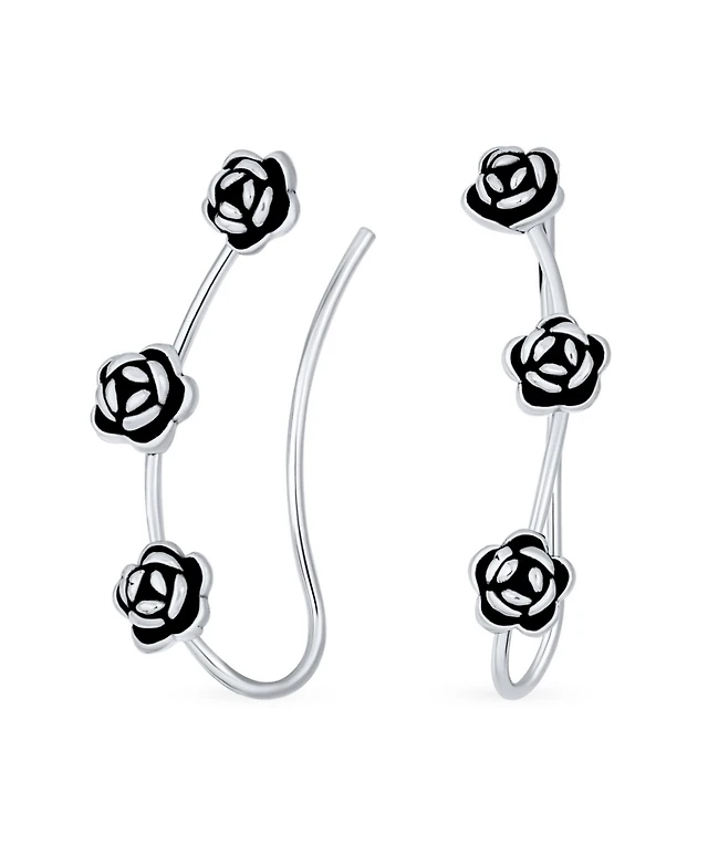 Bling Jewelry Retro 3D Flower Three Roses Wire Ear Pin Climbers Crawlers Rose Earrings Oxidized Sterling Silver