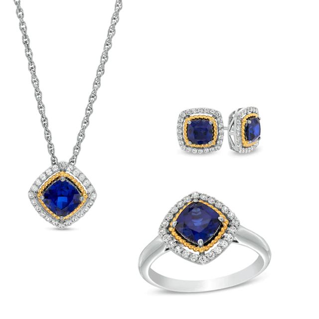 Blue and White Lab-Created Sapphire Frame Pendant, Ring and Earrings Set in Sterling Silver and 14K Gold Over Silver