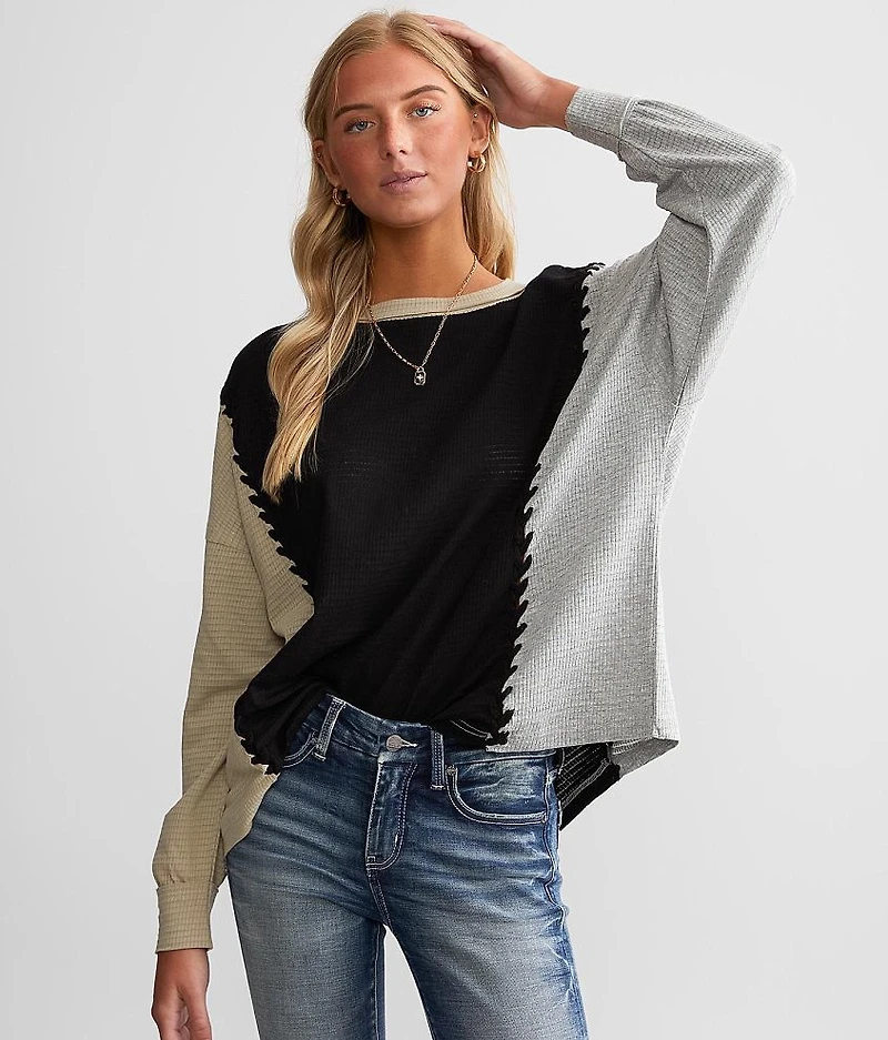 Oversized color block pieced raw edge top Bust measures 52" on size small Body length 24" on size small