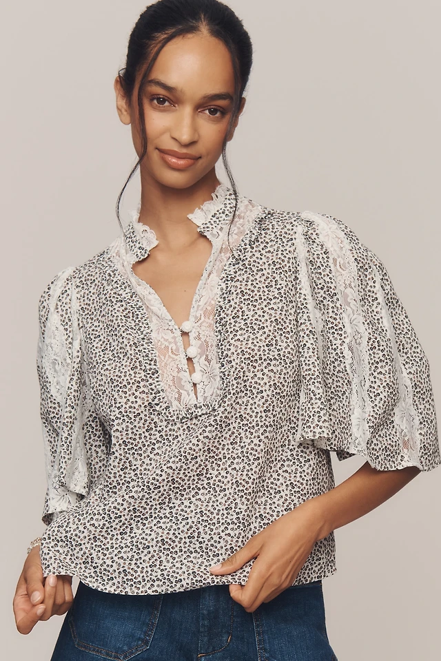 By Anthropologie Cape-Sleeve Lace-Trim Blouse