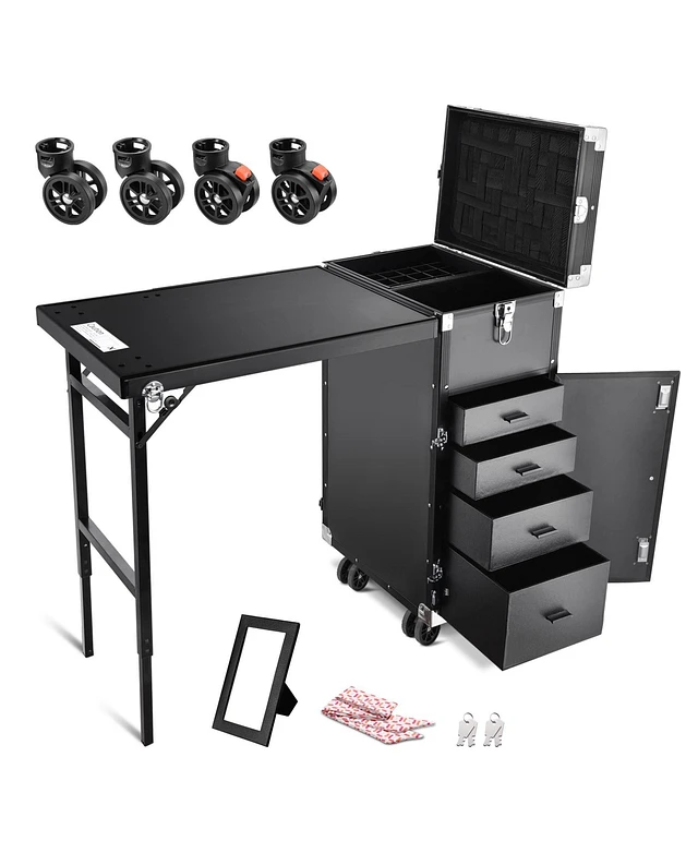 Byootique Aluminum Rolling Nail Table with Train Case Cosmetic Organizer Black