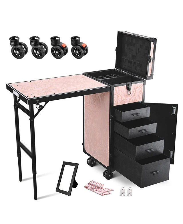 Byootique Rolling Nail Table w/ Makeup Case Cosmetic Organizer Aluminum Pink
