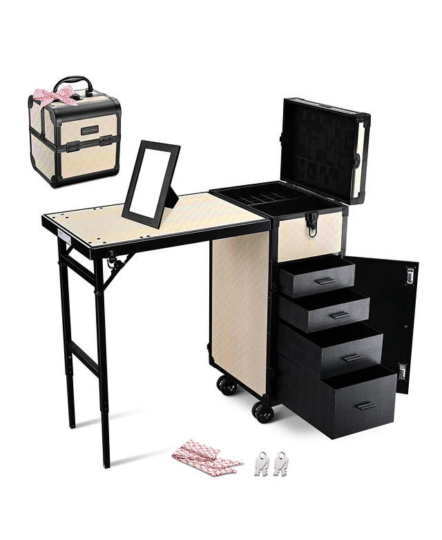 Byootique Aluminum Rolling Nail Table with Train Case Cosmetic Organizer Black