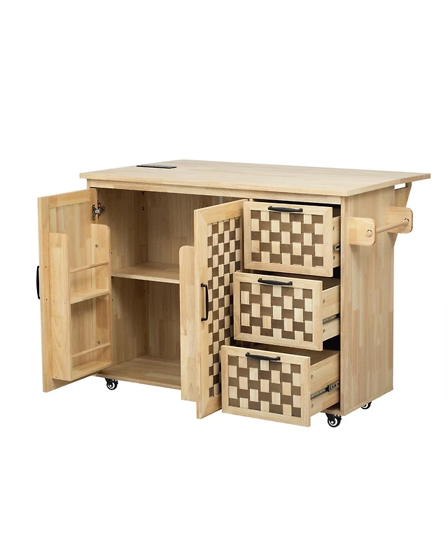 Casainc 53.2" Mdf + Rubber Wood + Solid Wood Feet 3D Woven Checkerboard Drop Leaf, Rolling Cart, Power Outlet, 3 Drawers and 2 Cabinets Kitchen I