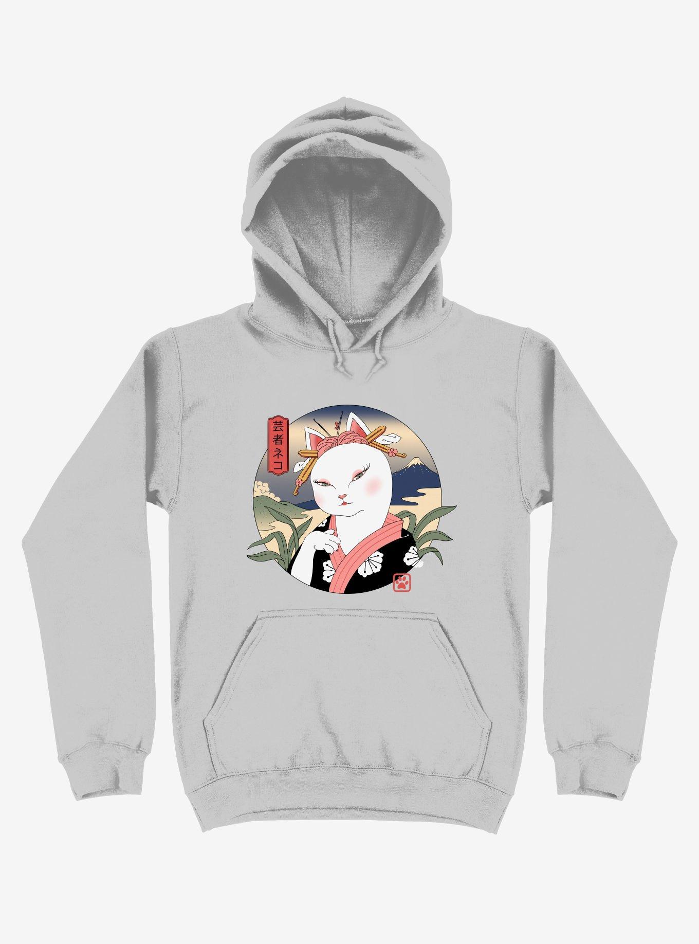 This kitty's feline fine. Our silver pullover hoodie features a pretty white geisha cat. Officially licensed art from Vincent Trinidad.