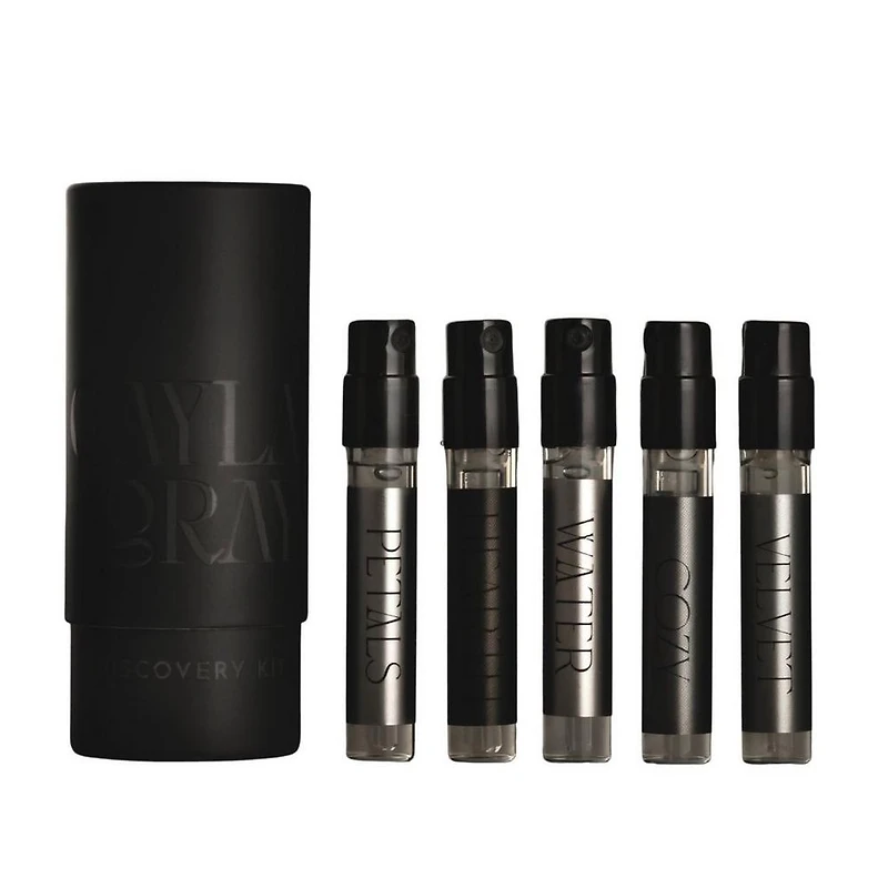 Fragrance Discovery Kit. Features: Clean, non-toxic fragrances made with transparent ingredients. A 5-piece sampler to explore the full Cayla Gray collection. Includes 2 ml sprays of Hearth, Cozy, Water, Petals, and Velvet.. Fragrance Family: Mixed (Floral, Fresh, Warm, Woody, Sweet). Key Notes: Hearth Smokey Balsam & Amber Velvet Black Cherry & Oakmoss Water Lotus & Cedarwood Petals Jasmine & Cashmere Cozy Vanilla & Tonka Bean.