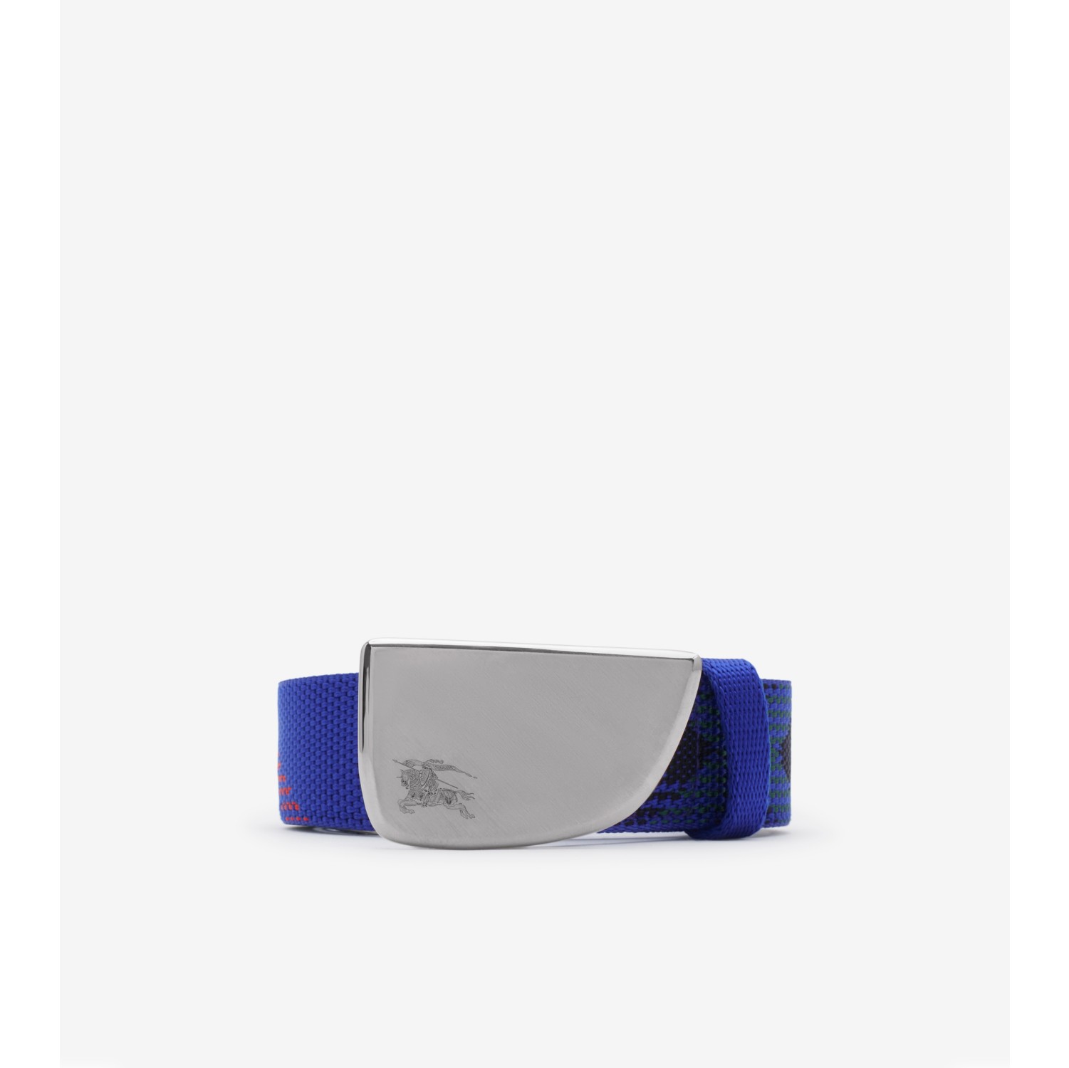 An Italian-made belt in nylon webbing, jacquard-woven with the Burberry Check. The palladium-plated shield buckle is engraved with the Equestrian Knight Design. Hand-painted edges Engraved Equestrian Knight Design at buckle