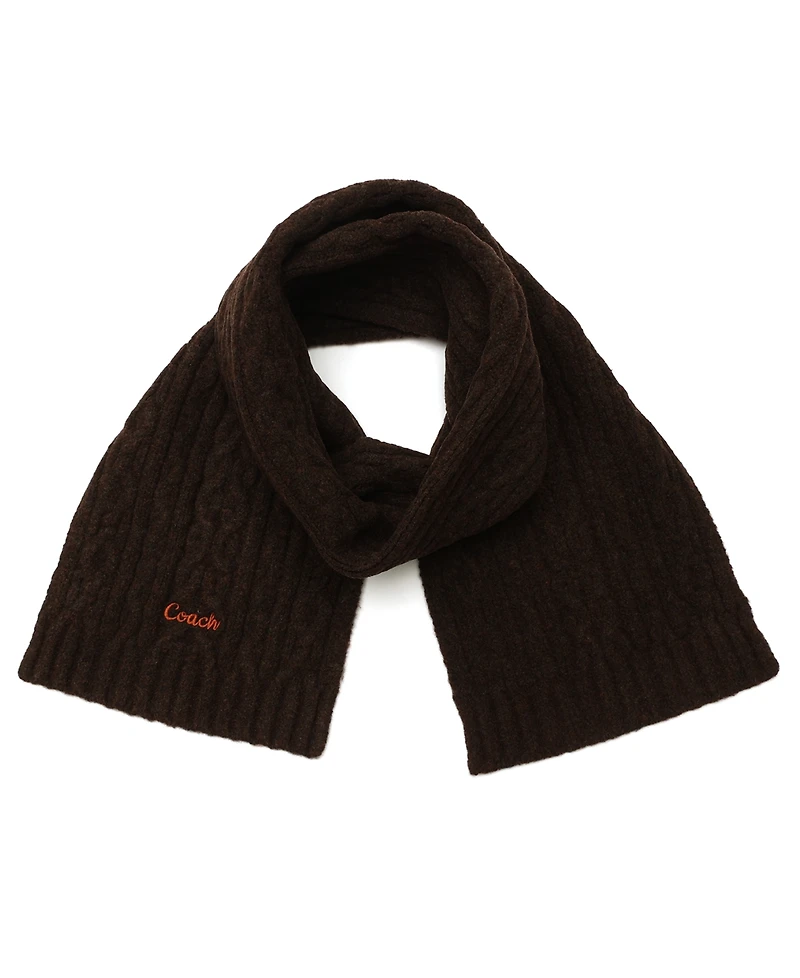 Combining comfort with refined details, this Coach muffler features a classic cable knit design accented by subtle embroidery. Soft and warm, it adds a stylish layer for chilly days.