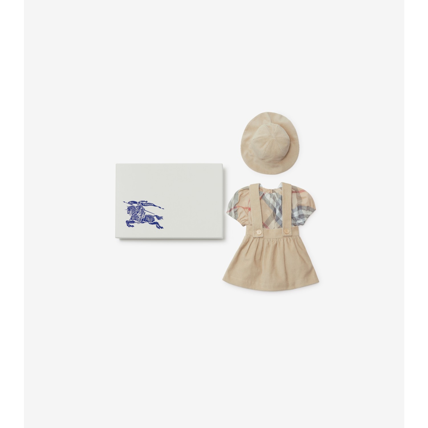 A cotton corduroy dungaree-style skirt with a matching bucket hat, and a cotton playsuit woven in Italy with the Burberry Check. Playsuit: back button closure, press-stud gusset Skirt: button closure, elasticated waist Presented in a Burberry gift box