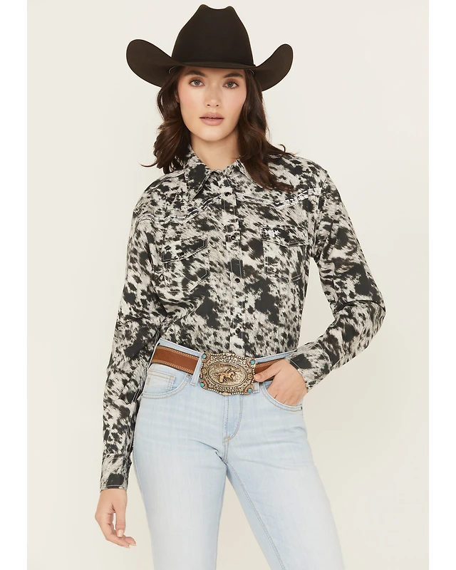 Cowgirl Hardware Women's Cowhide Print Long Sleeve Snap Stretch Western Shirt
