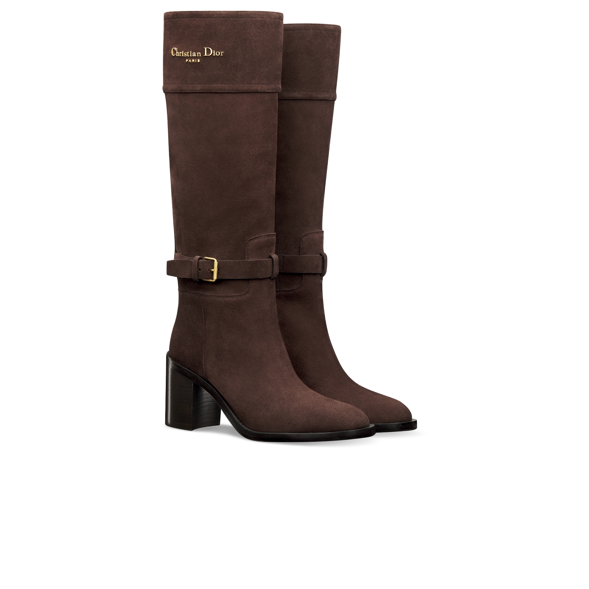 The D-Town heeled boot is a style with a timeless look. The tubular silhouette crafted in tobacco brown suede calfskin is embellished with a gold-finish metal Christian Dior Paris signature on the side, while an adjustable buckled strap highlights the ankle. A 5-cm (2-inch) block heel completes the refined shoe. Main composition: suede calfskin. Calfskin and technical fabric lining. Gold-finish metal Christian Dior Paris signature on the side. Adjustable buckled ankle strap. Side zip closure. Cow leather and TPU insole. Calfskin and rubber sole with star, Christian Dior's lucky symbol. Made in Italy