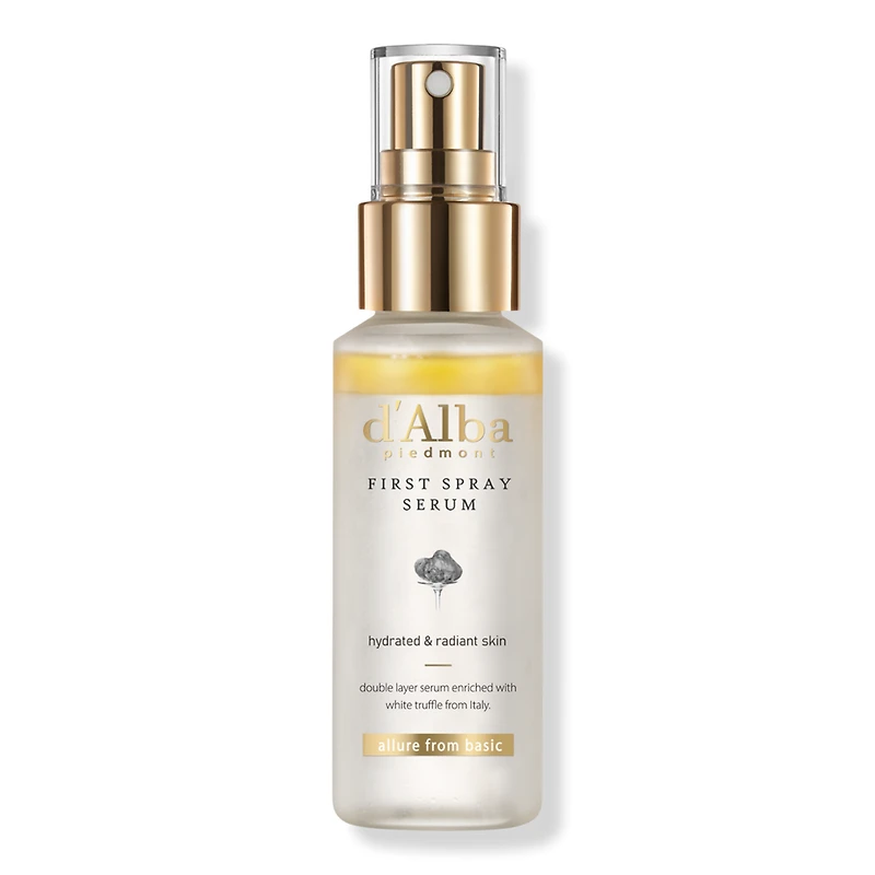 WHITE TRUFFLE FIRST SPRAY SERUM 1.69OZ. Benefits: Replenishes dehydrated skin with a glass skin glow.. Smooths fine texture and helps improve elasticity.. Provides immediate radiance, even over applied makeup.. Supports softer, more supple texture.. Features: Ultra-fine mist delivery penetrates seamlessly through makeup.. Dual-layer formulation with nourishing oil and essence.. Lightweight, fast-absorbing texture with a non-greasy finish.. Ideal for on-the-go hydration and makeup refresh.. Key Ingredients: Trufferol (White Truffle + Tocopherol): A patented antioxidant complex that supports elasticity, smooths fine lines, and boosts visible radiance.. Hydrating Oil Blend (Avocado, Sunflower, Meadowfoam): Locks in moisture for lasting supple hydration.