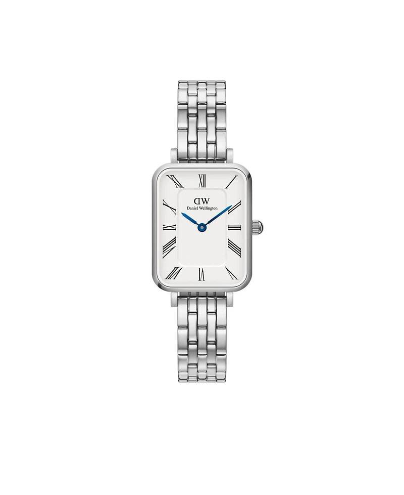 With vintage like-inspired design details-like the Roman Numeral dial and blue steel hands-this version of our Quadro watch strikes just the right balance between old-school and trending now. Features an interchangeable 5-link strap in silver.