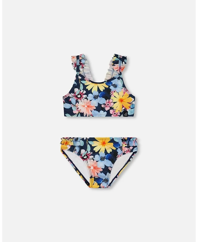 Deux par Deux Girl Printed Two-Piece Swimsuit Navy And Yellow And Pink Flowers - Toddler|Child