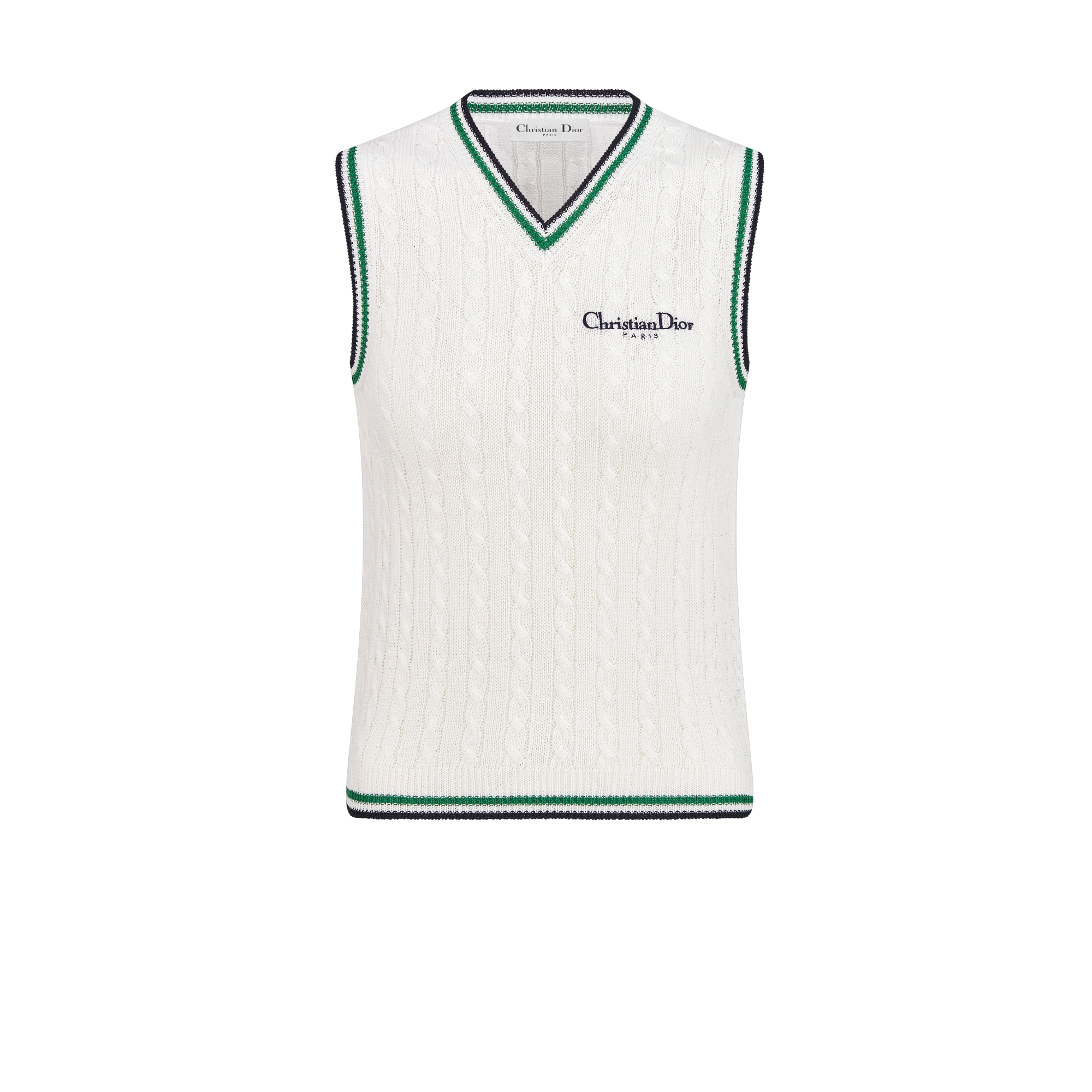 Part of the Dior Vibe capsule, the sweater vest reimagines sportswear codes with the House's couture spirit. Crafted in an ecru cotton and silk cable knit, it is distinguished by a fitted V-neck silhouette enhanced by pine green and black contrasting striped trim, while the Christian Dior Paris signature is embroidered on the chest. The sweater vest can be paired with other Dior Vibe creations to complete the look. Christian Dior Paris embroidery on the chest. Contrasting striped V-neck, hem and armholes. 70% cotton, 30% silk (8 gauge)*. Made in Italy. Treat with extra care and gently dry clean