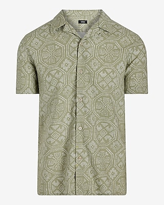 The breathable linen-blend shirt features a trendy camp collar, a full button front, short sleeves, and a dot geo print.