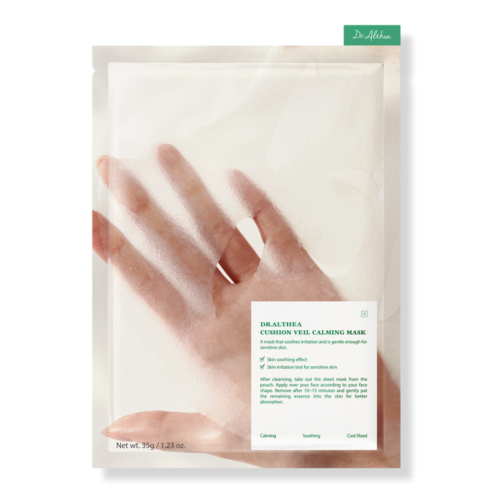 CUSHION VEIL CALMING MASK 4CT. Benefits: Soothes and Hydrates: Instantly calms irritation and deeply hydrates. The CICA Complex, with Asiaticoside and Madecassoside, soothes sensitive skin.. Plush and Gentle Sheet: Dual-gel cooling sheet delivers twice the cooling for instant relief. Its soft, smooth texture comforts sensitive skin without irritation.. Protects Sensitive Skin: Gentle formula shields skin from external stressors, helping to maintain calm and healthy skin.. Moisture Barrier: Packed with B-complex vitamins, this mask helps reinforce the skins natural barrier by sealing in moisture and preventing moisture loss, leaving skin soft and smooth.. Key Ingredients: Cica Complex: A balanced blend of Asiaticoside and Madecassoside to maximize soothing effects on the skin. Chamomole Extract and Panthenol: Deeply hydrates and strengthens the skin barrier for enhanced protection. Inje Betula Water: Antioxidant-rich formula that hydrates and revitalizes the skin. :