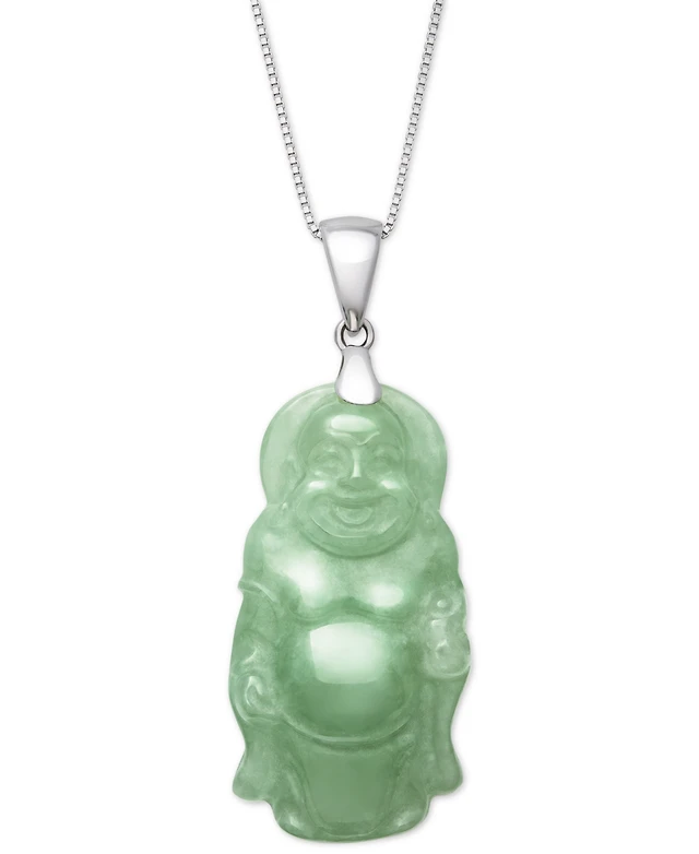 Dyed Green Jade Carved Buddha 18" Pendant Necklace in Sterling Silver