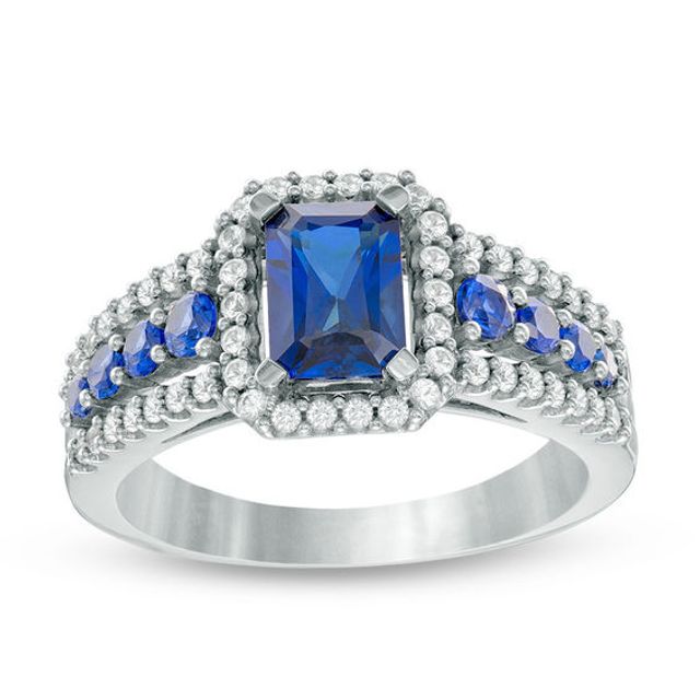 Emerald-Cut Lab-Created Blue and White Sapphire Frame Ring in Sterling Silver