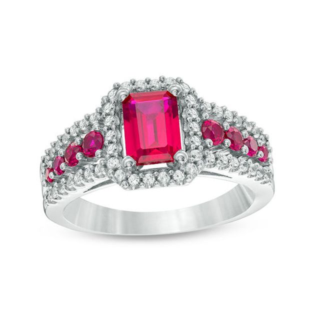 Emerald-Cut Lab-Created Ruby and White Sapphire Frame Ring in Sterling Silver