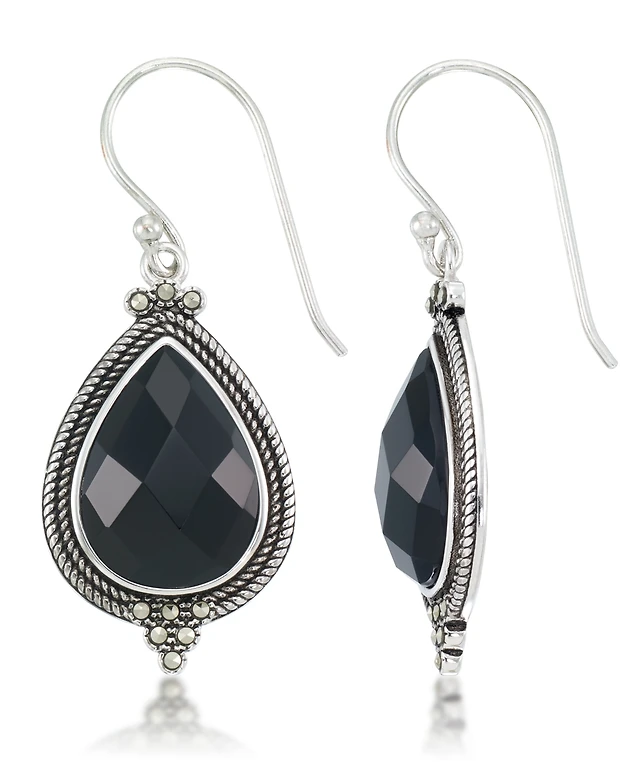 Marcasite and Faceted Onyx Teardrop Wire Earrings in Sterling Silver