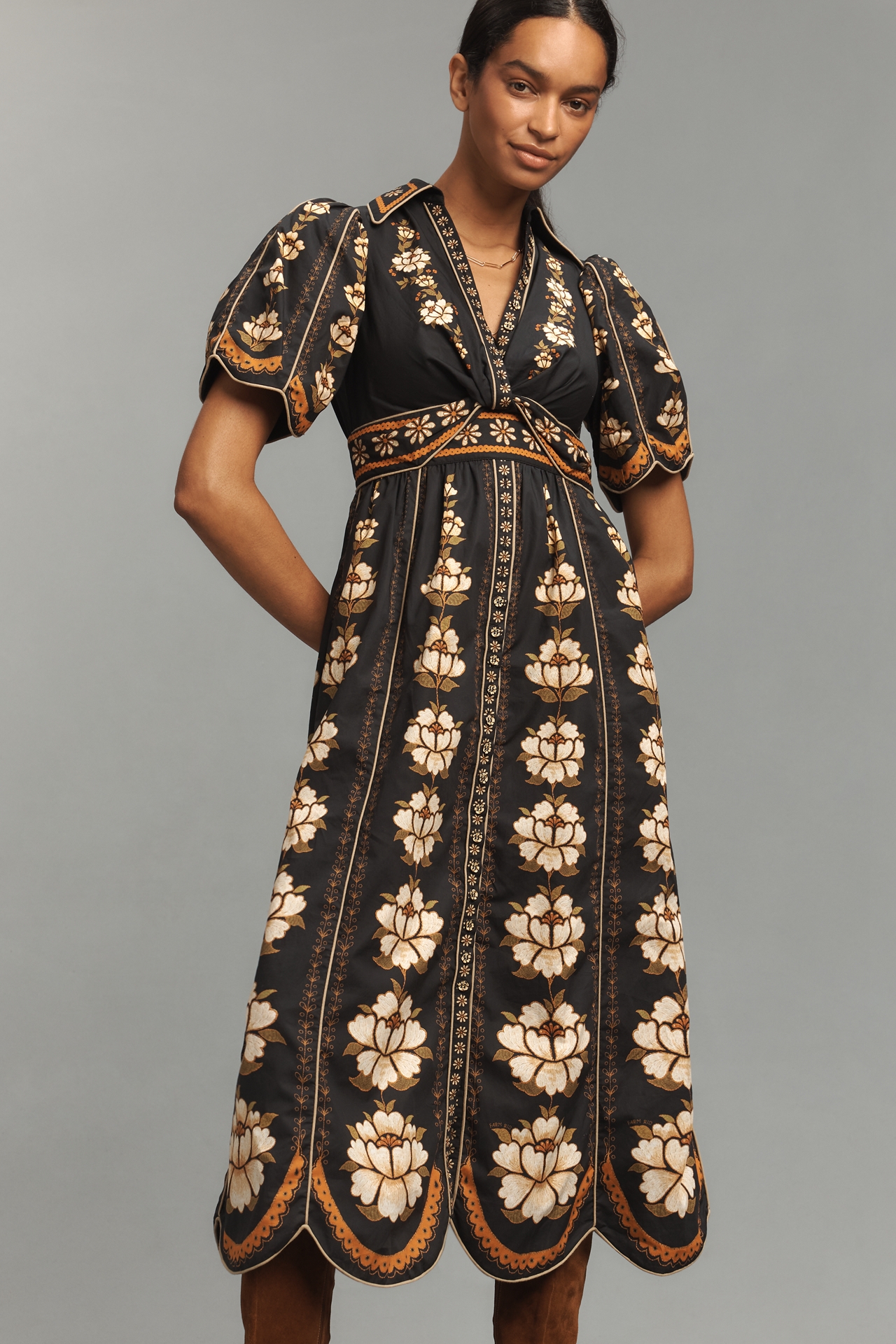 Farm Rio Embroidered Floral Short-Sleeve Midi Dress