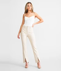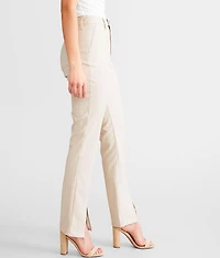 High rise Slim through the hip and thigh 14" bottom opening Split hem