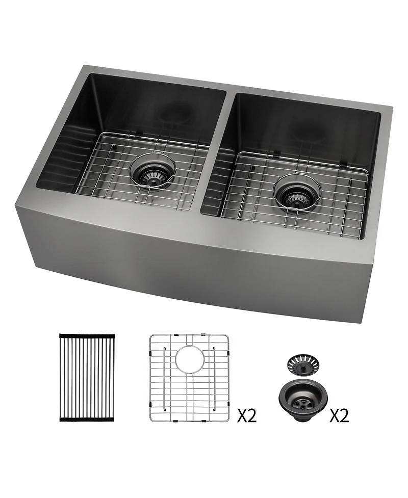 Introduce a bold modern statement to your kitchen with this expansive 36 inch gunmetal black farmhouse sink Expertly crafted from 16 gauge stainless steel with a nano coating it features two deep 10 inch basins efficient drainage and soundproofing for a durable quiet and highly functional centerpiece