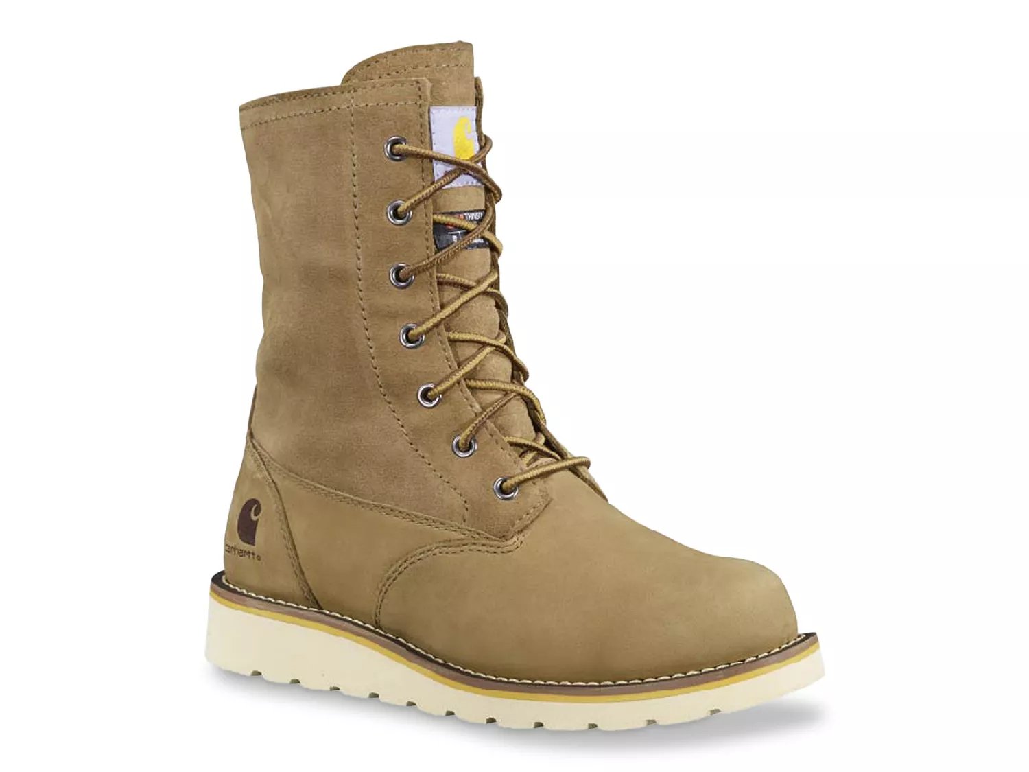 The Fold Down winter work boot from Carhartt is all about sophisticated style and waterproof protection. Crafted with leather and suede upper, this wedge boot comes with FastDry technology lining and waterproof, breathable Storm Defender membrane to provide dry comfort. The 200g 3M Thinsulate insulation offers warmth while dual-density rubber outsole with maximum surface contact provides amazing slip resistance. In addition, this Soft Toe boot is ASTM F2892-18 tested to provide optimal protection from electrical hazards.