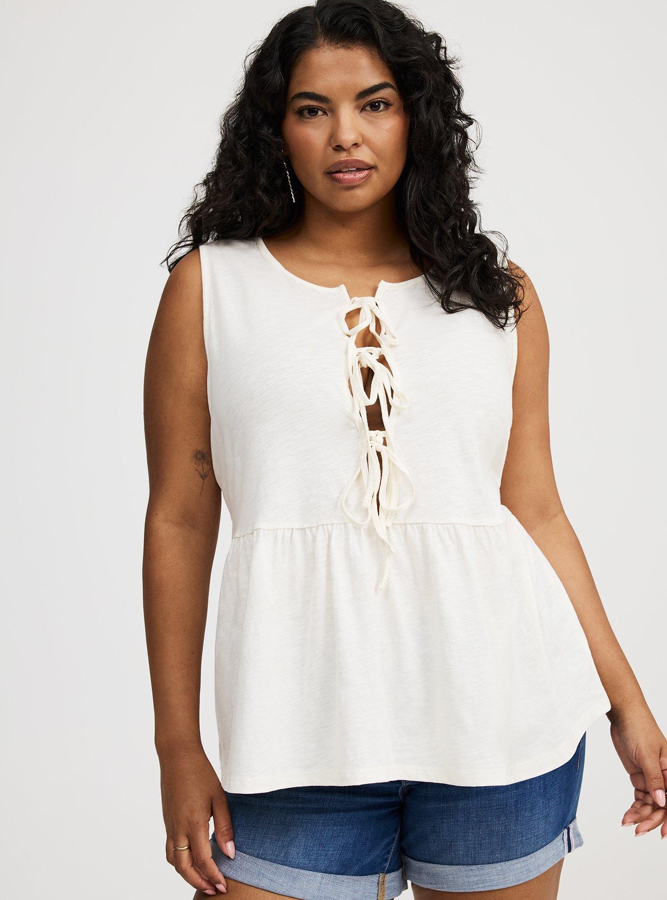 FIT Measures 29'' from shoulder (size 2). MATERIALS + CARE Heritage Slub knit fabric: Your essential, textured cotton fabric. 100% cotton. Machine wash cold. Dry low. Imported. DETAILS High neckline. Sleeveless. Front cut-out and tie details. Peplum bottom hem.