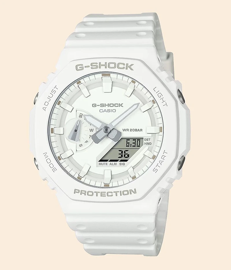 Stainless steel case back watch Two-hand quartz movement Multi function analog/digital subdials Shock/Magnetic resistant Double LED light Speed indicator 1/100 second stopwatch Countdown timer 5 daily alarms 31 time zones Silicone strap Case measures 48.5mm(L) x 45.4mm(W)