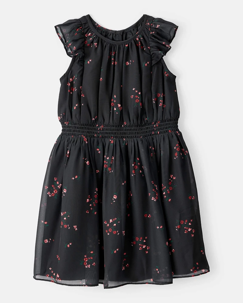 Girls Floral Short-Sleeve Occasion Dress - Black
