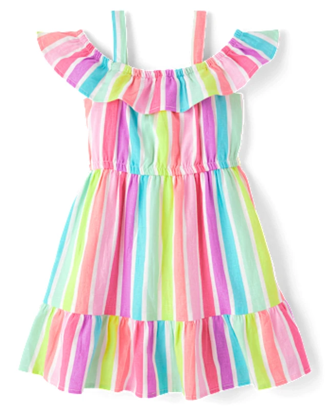 Girls Rainbow Striped Linen-Blend Off Shoulder Dress - Swim