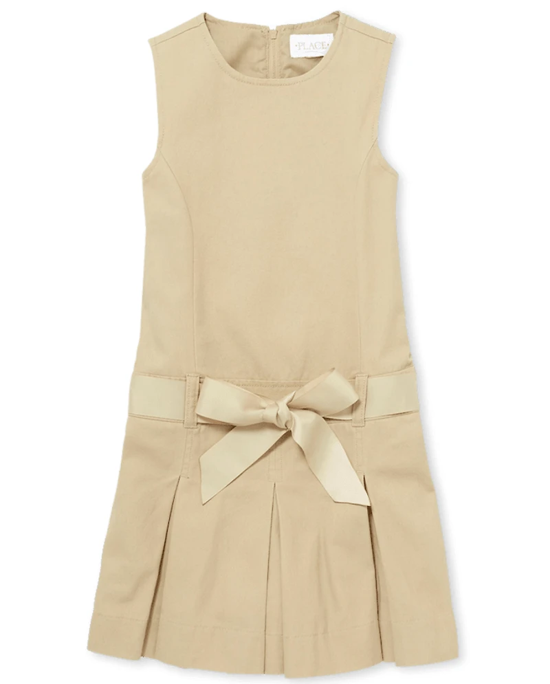 FABRICATION: 97% cotton/3% spandex twill, 80% polyester/30% cotton lining; importedFIT & DESIGN: Round neck, above-knee lengthCLOSURE: Back zipperFEATURES: Soft hand feel, kid-perfect comfort, everyday durability, naturally breathable cotton, made-to-move stretch, non-functional bow at drop-waist seam, fabric finished for added softness and to reduce shrinkage