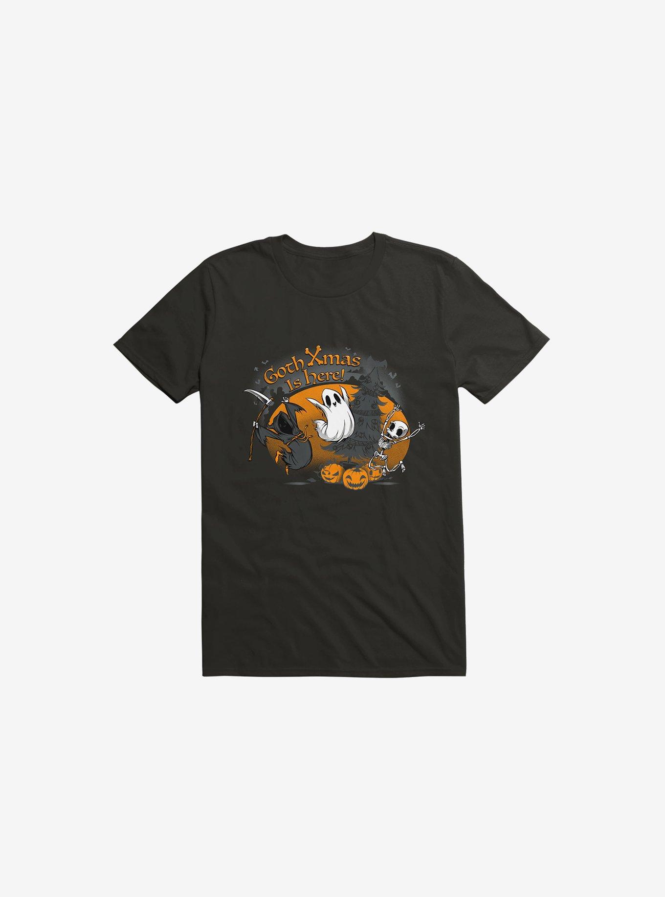 Goth Xmas is really just Halloween. Discuss. This lightweight black graphic tee proclaims "Goth Xmas is here!" and features a reaper, ghost and skeleton jumping for joy beside a black tree and jack-o'-lanterns. Officially licensed art from Tobe Fonseca.