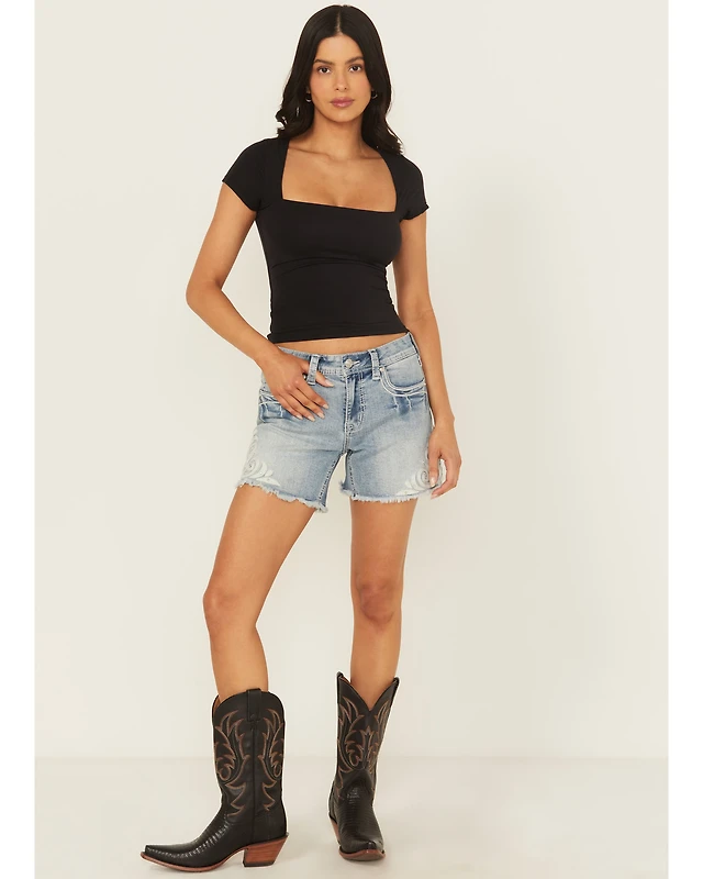 Grace LA Women's Medium Wash Mid Rise Embroidered Stretch Denim Shorts