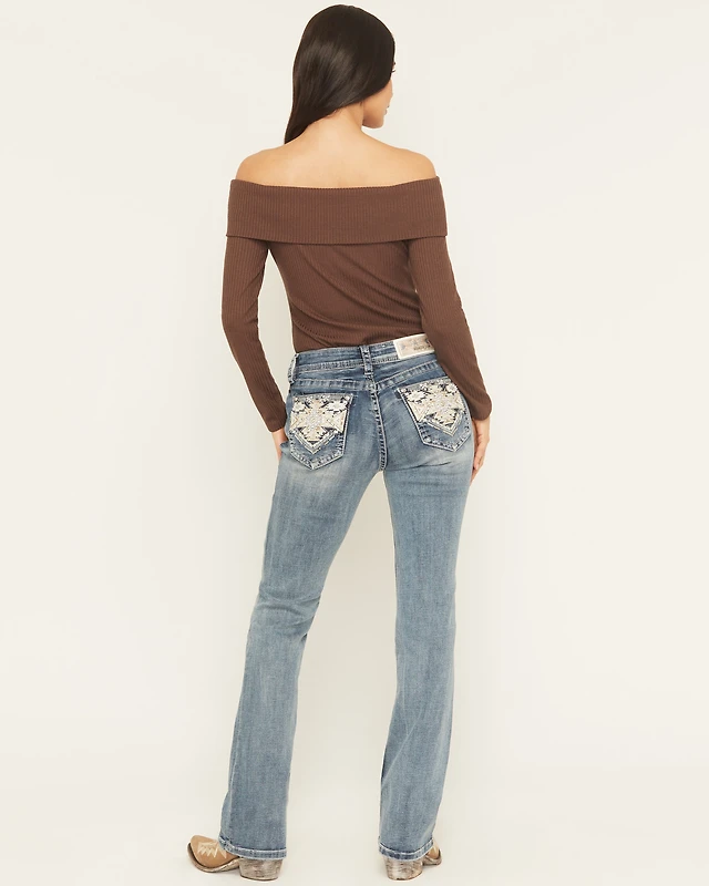 Grace LA Women's Medium Wash Mid Rise Geo Pocket Bootcut Stretch Denim Jeans