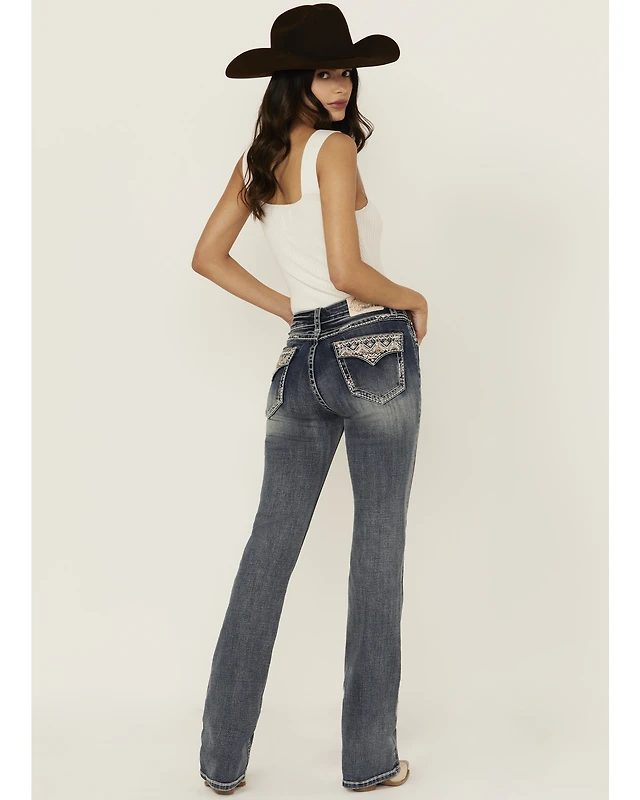 Grace LA Women's Medium Wash Geo Print Embroidered Bootcut Stretch Denim Jeans
