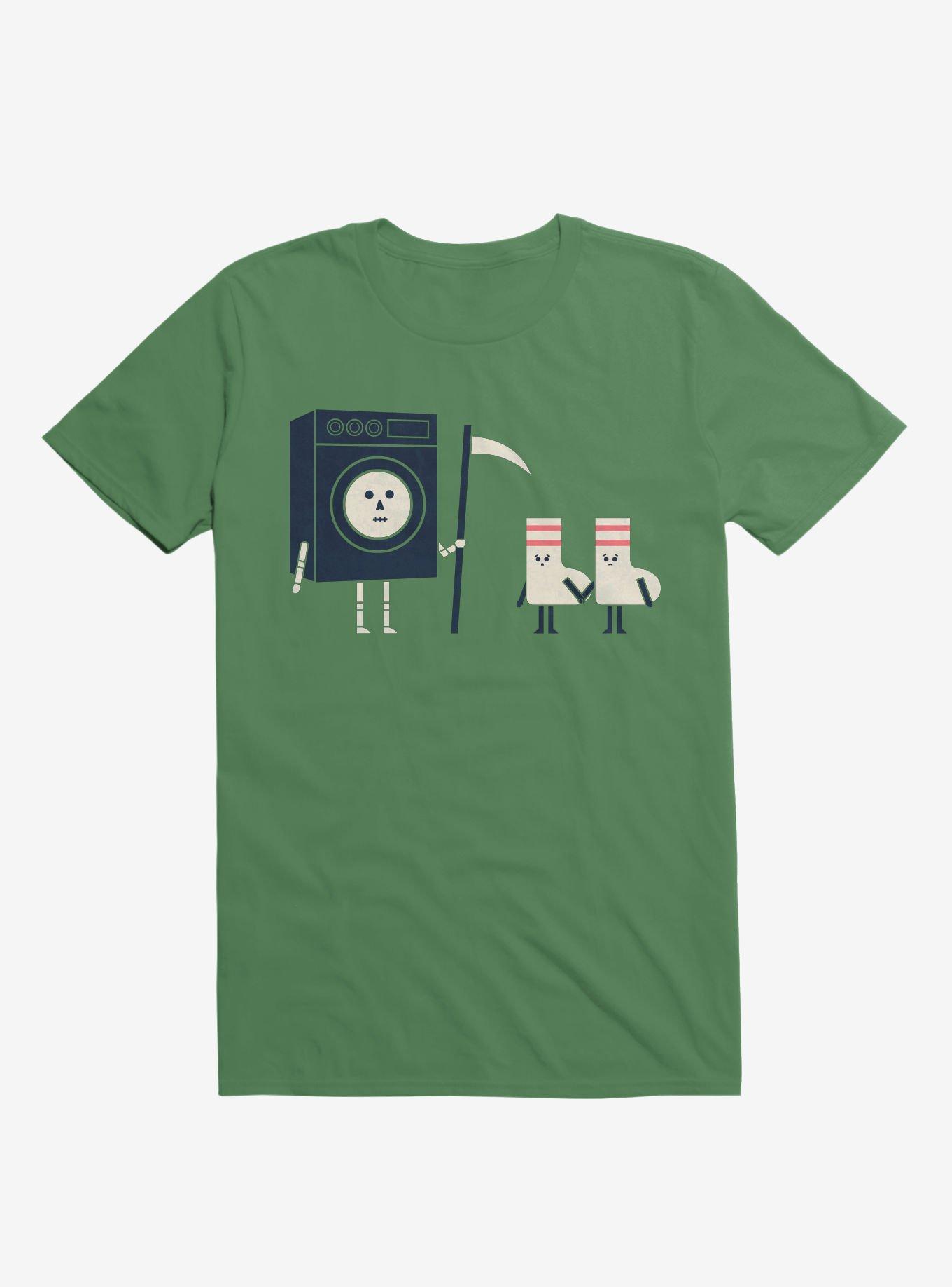 The Grim Washer wants your old socks. (R.I.P. socks.) This lightweight Irish green graphic tee shows them minutes before they crossed over to the sock afterlife. Officially licensed art from handsoffmydinosaur.