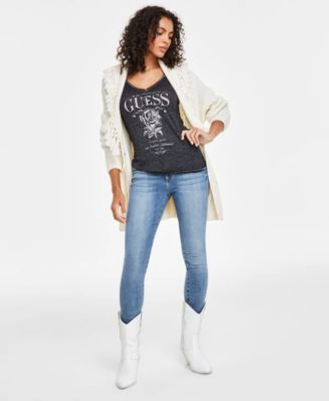 Guess Womens Short Sleeve Rose Graphic Top Belted Cardigan Sweater Skinny Denim Jeans