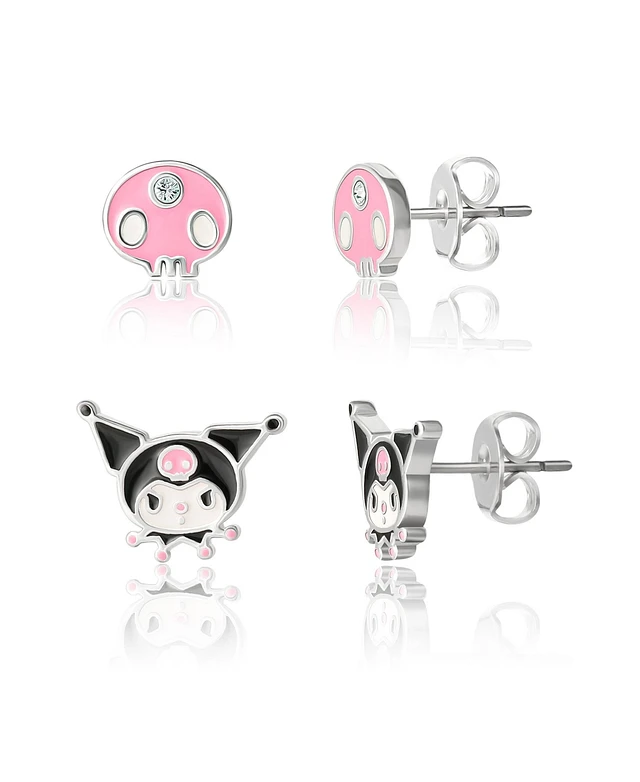 Hello Kitty Sanrio Pink Skull and Kuromi Silver Plated Earring Set - 2 Pairs, Officially Licensed