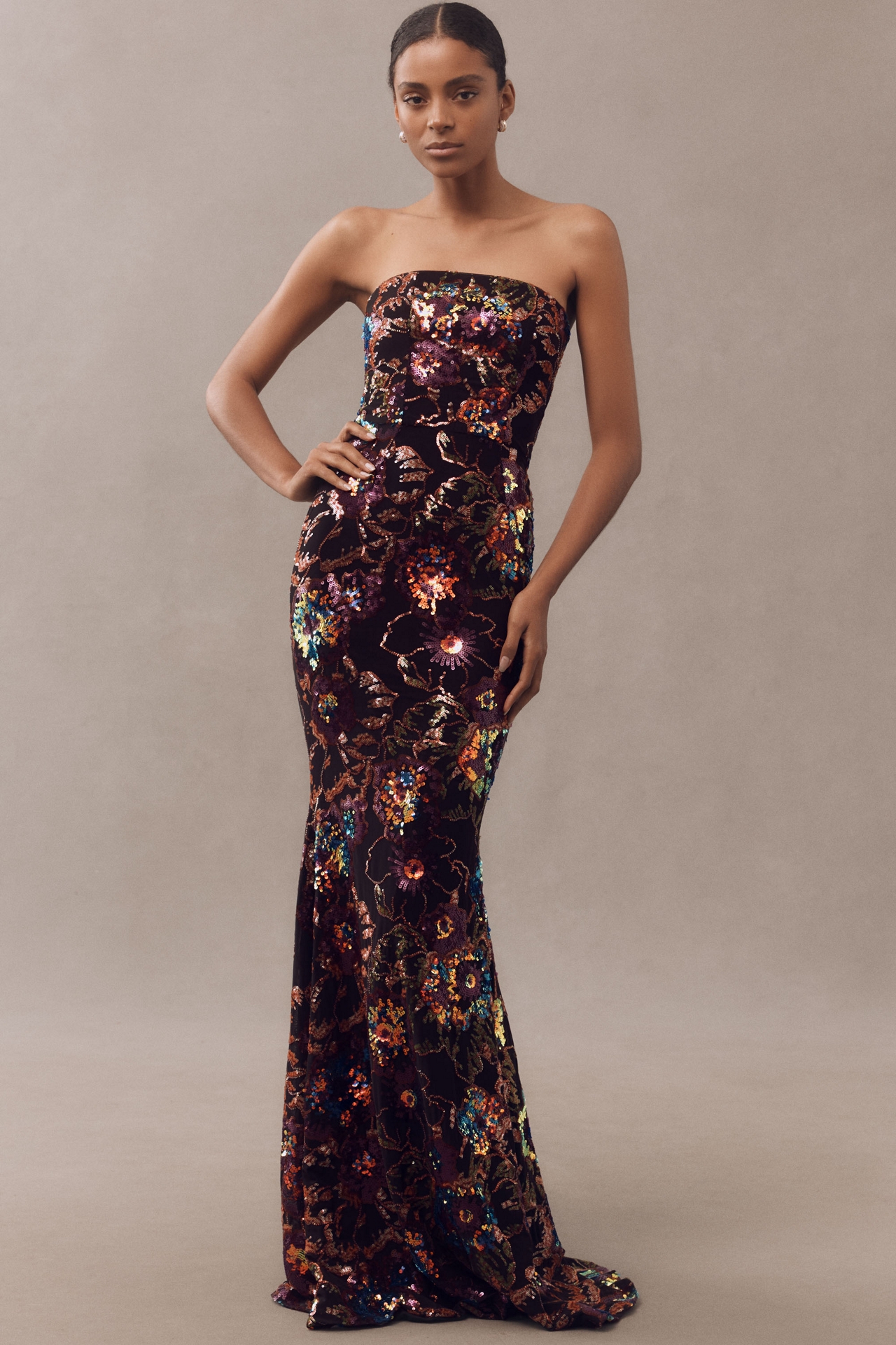 The Helsi Helen Strapless Maxi Dress dazzles with intricate floral sequins and a curve-hugging mermaid silhouette, offering a glamorous statement perfect for formal occasions.