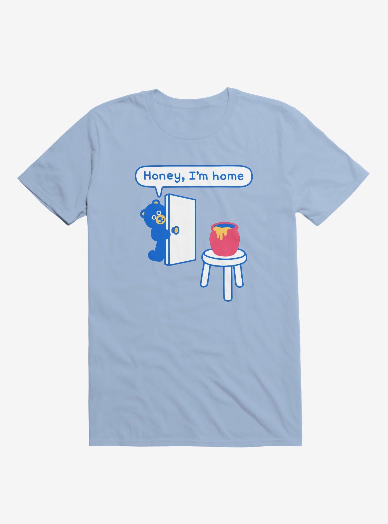 Honey, I'm home! Nothing like greeting your honey after a long, hard day. Especially if peanut butter and toast are there as well! But we imagine the hungry bear on the front of this lightweight light blue graphic tee likes to unwind by enjoying it straight out of the pot. Ah, well. To each his own. Officially licensed art from Obinsun.