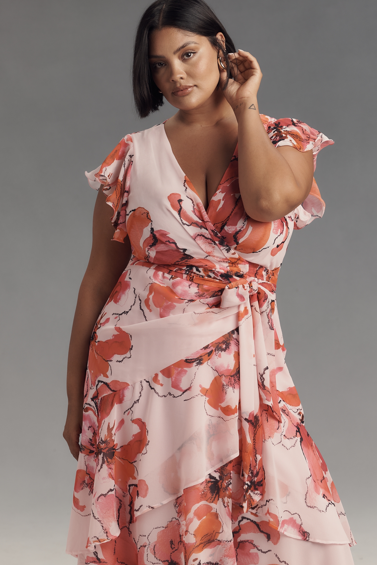 Hutch Ruffle-Sleeve V-Neck Floral Wrap Midi Dress in Bloomington, MN