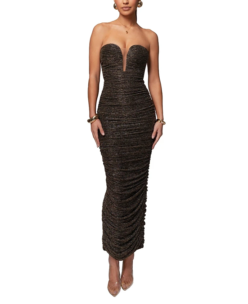 Make a bold statement with our Metallic Mesh Maxi Dress. Crafted from shimmering black and gold metallic fabric, its ruched design enhances your curves with effortless glamour. The sweetheart neckline, framed by nude mesh, creates an edgy yet elegant illusion. Complete with padded, wired bra cups, double lining for comfort, and a hidden back zipper, this maxi-length masterpiece is your new go-to for lavish evenings.
