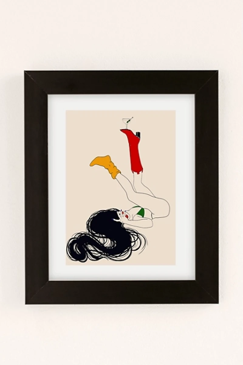 Art print by Juliana Kokolari featuring a lounging figure balancing a martini glass. Printed on archival paper made from cotton pressed in Italian mills, this high-quality art print is available in sizes and frames just right for your space. First select your frame (or go frameless), then select your size.