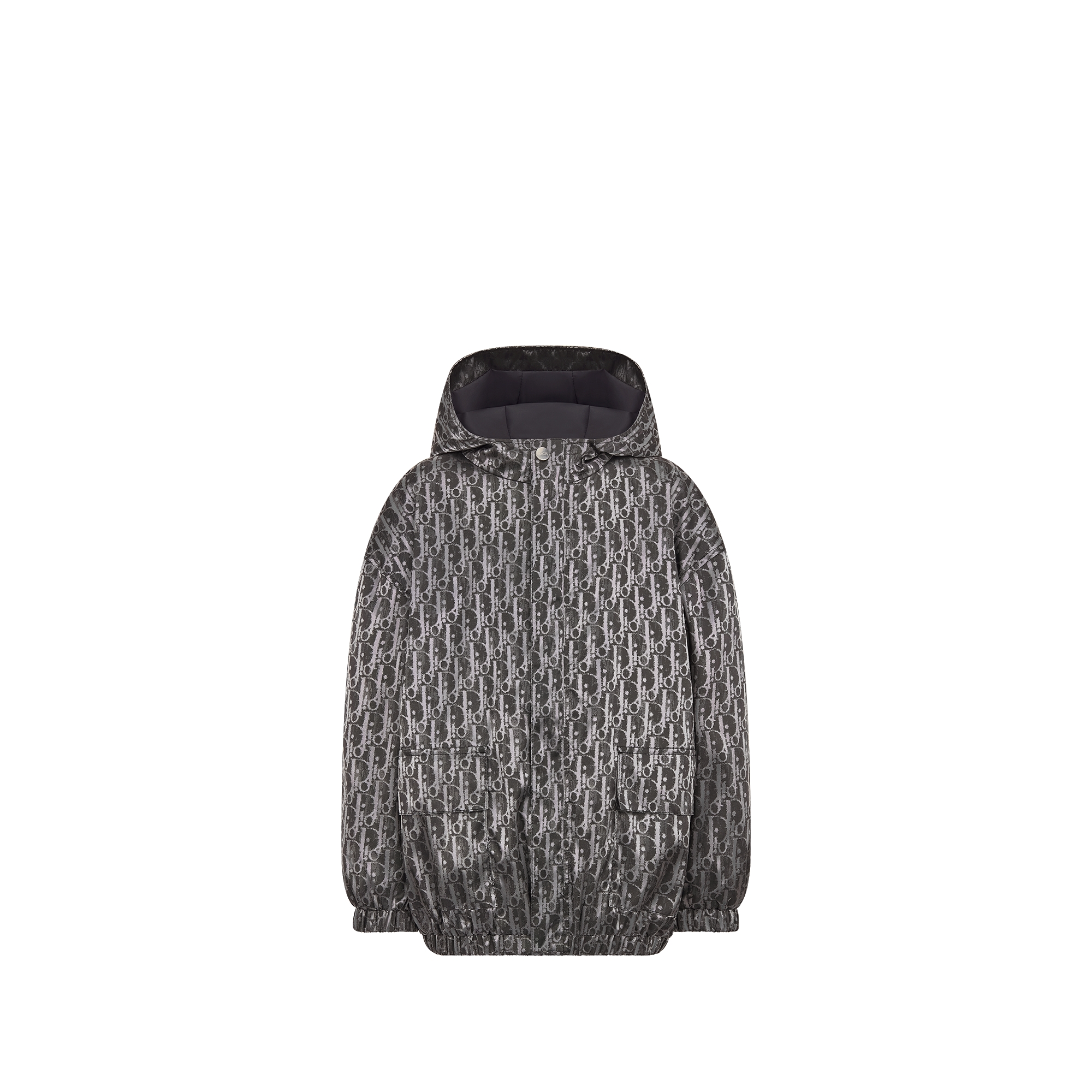 The windbreaker showcases House heritage with the hallmark Dior Oblique motif. Crafted in metallic gray technical jacquard, it displays a straight silhouette completed by a hood, concealed zip closure and flap patch pockets, as well as a stretch hem and cuffs for added comfort. Worn with pants from the collection, the water-repellent windbreaker will brighten up rainy days. Hood. Concealed front zip closure with metal snap. Stretch hem and cuffs. Two front flap patch pockets. Main composition: 100% polyamide. Black lining composition: 100% polyester. Water-repellent